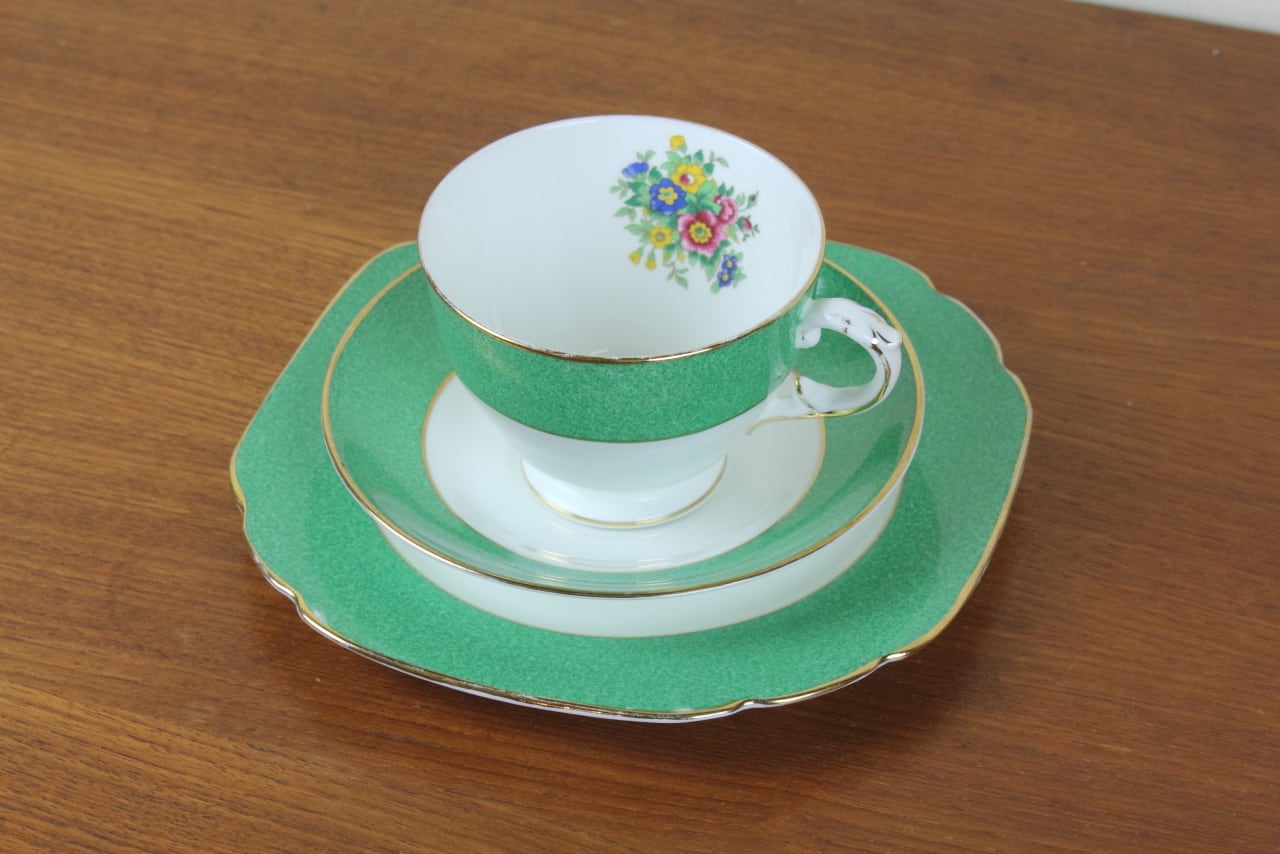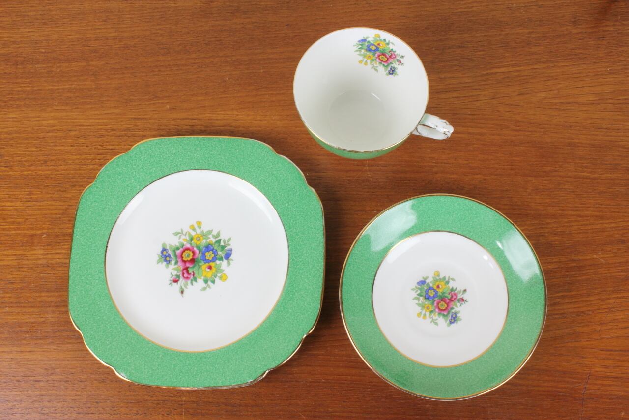 コールポート トリオ パウダーグリーン ティーカップ プレート ケーキ皿 花柄 COALPORT ヴィンテージ 陶磁器 イギリス