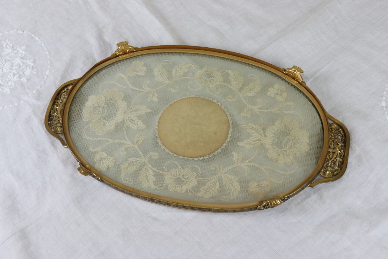 プチポワン ドレッシングトレイ イギリス アンティーク 刺繍 ガラス オーバル ヴィンテージ 雑貨 49-3