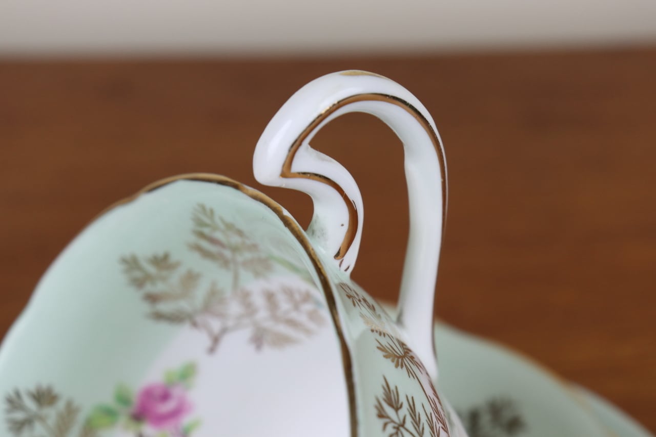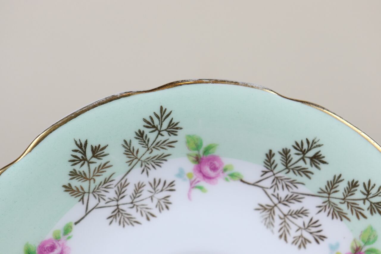 淡いパステルグリーンに薔薇と繊細な金彩模様が可愛らしい