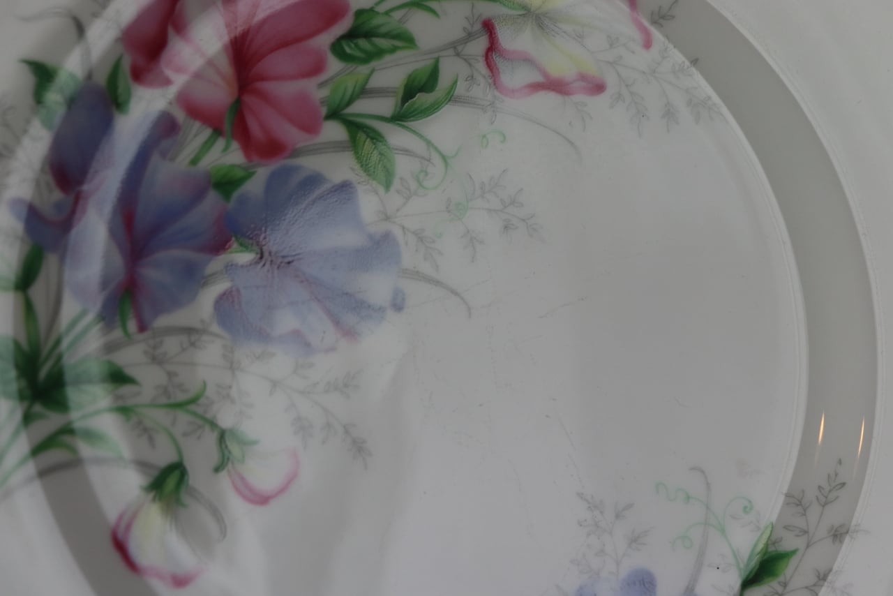 ブルーとピンクのスイートピーが爽やかに描かれた清楚な印象のお品です。