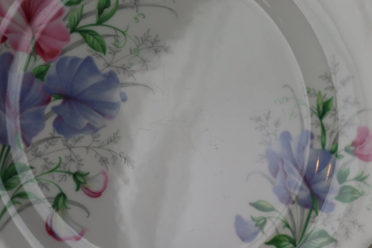ブルーとピンクのスイートピーが爽やかに描かれた清楚な印象のお品です。