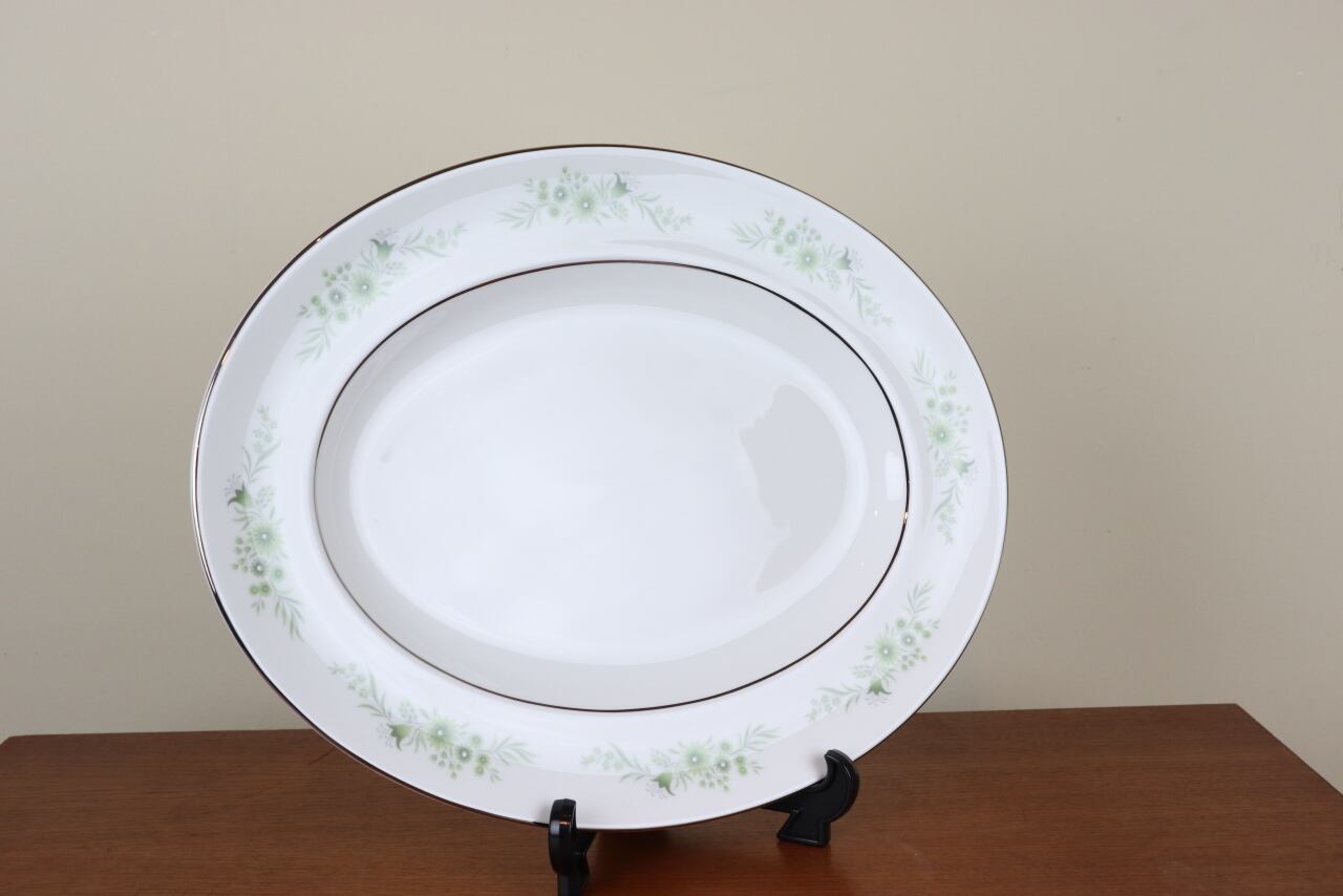 グリーンの花模様にプラチナの縁取りが清楚で優しい印象のお品です。