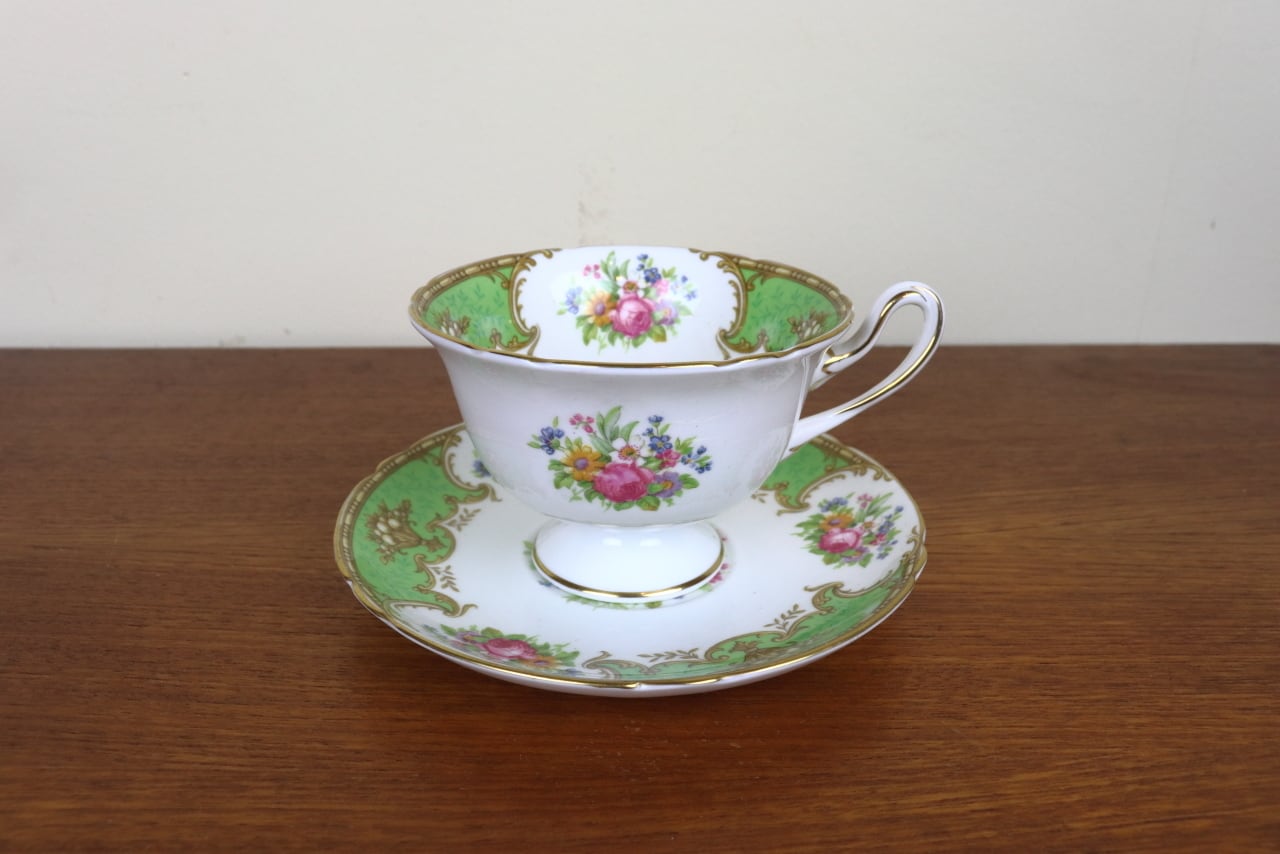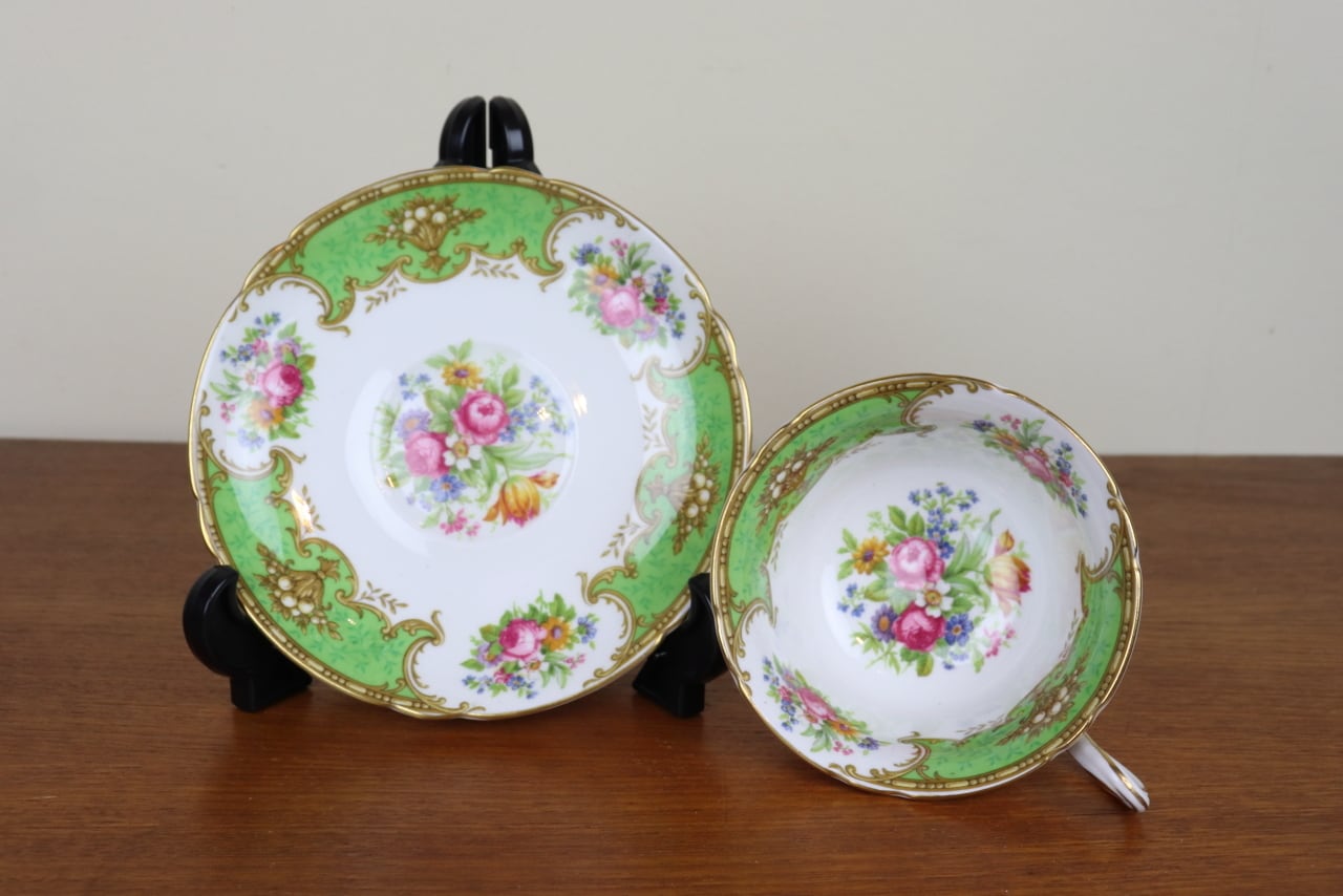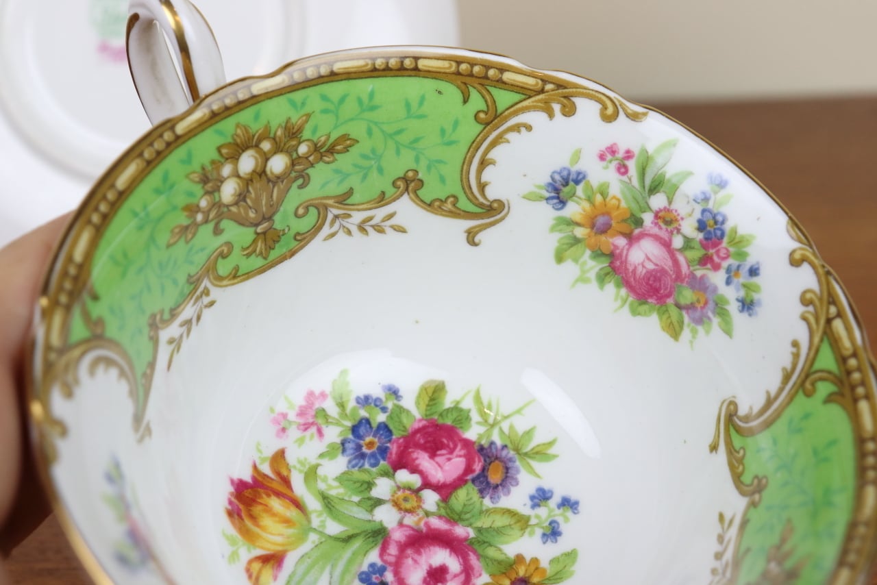 シェリー Shelley ダッチェス Duchess デュオ カップ&ソーサー ティーカップ ゲインズシェイプ 花柄 グリーン 緑 イギリス せ15