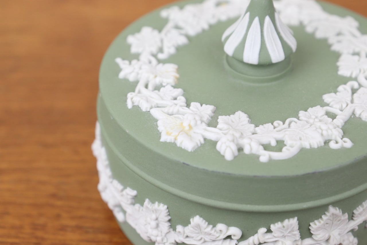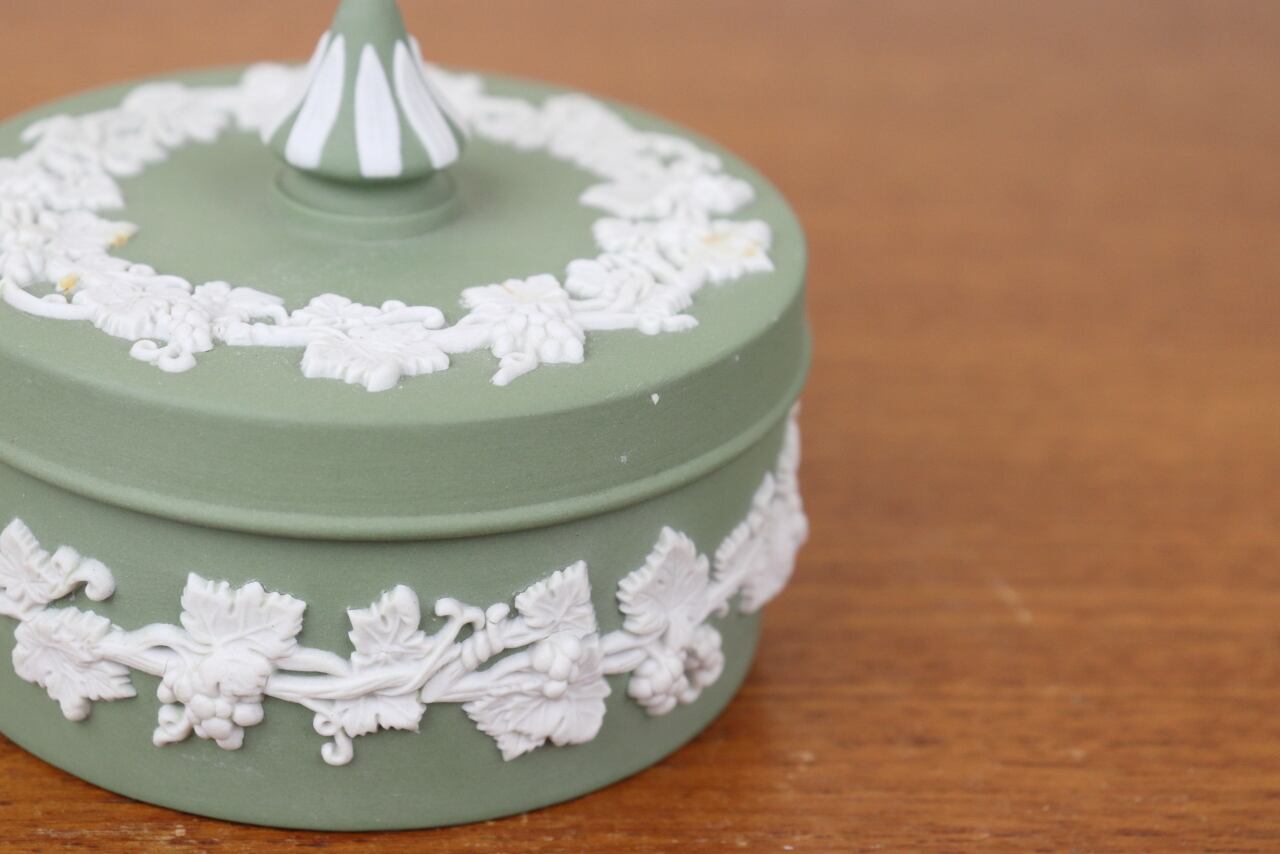 ウェッジウッド ジャスパー 小物入れ セージグリーン ラウンドボックス 葡萄柄 WEDGWOOD イギリス ヴィンテージ く36-1