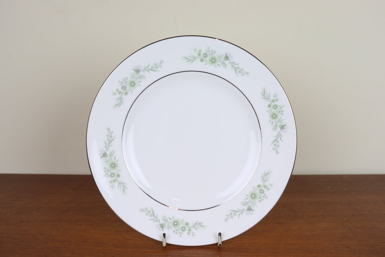 グリーンの花模様にプラチナの縁取りが清楚で優しい印象のお品です。